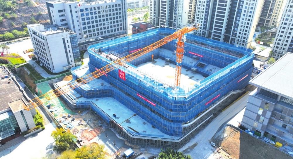 4日上午,记者走进该项目现场看到,一座悬挂“封顶大吉”、身披“蓝色防护服”的崭新建筑拔地而起。施工人员各司其职、作业有序,现场一派繁忙有序的建设景象。