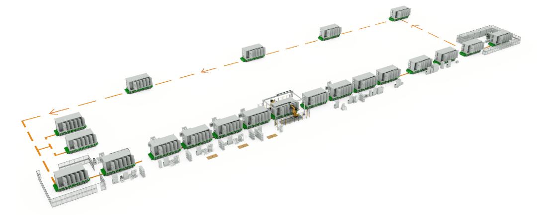 方形储能模组PACK智能生产线是将方形电芯组装成模组,再将模组组装成储能电池包的自动化生产线,其工艺流程包括:电芯上料、OCV/IR、电芯处理、模组堆叠、汇流排焊接、焊接检查、模组测试(EOL),PACK组装等。