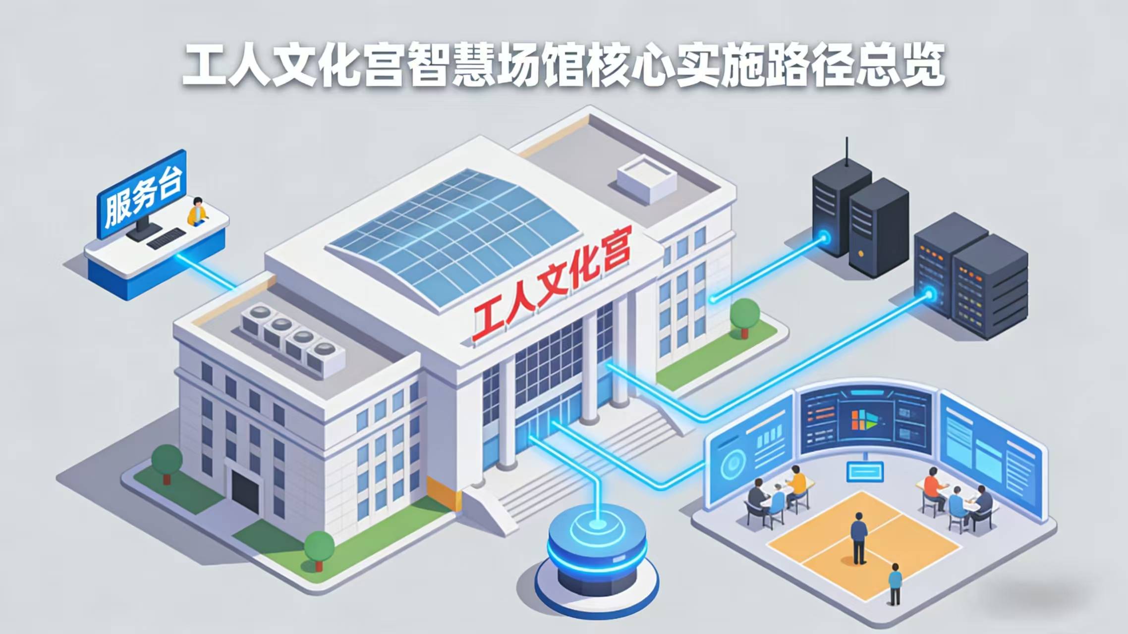 工人文化宫智慧场馆解决方案以“全域协同、精准服务、高效运营”为核心,构建分层架构、多端联动、全场景覆盖的智慧运营体系,通过软硬件深度融合,打通服务、管理、运营全流程,实现场馆从传统运营向智慧化运营的全面升级,为职工群众提供更便捷、优质、多元的文化体育服务。