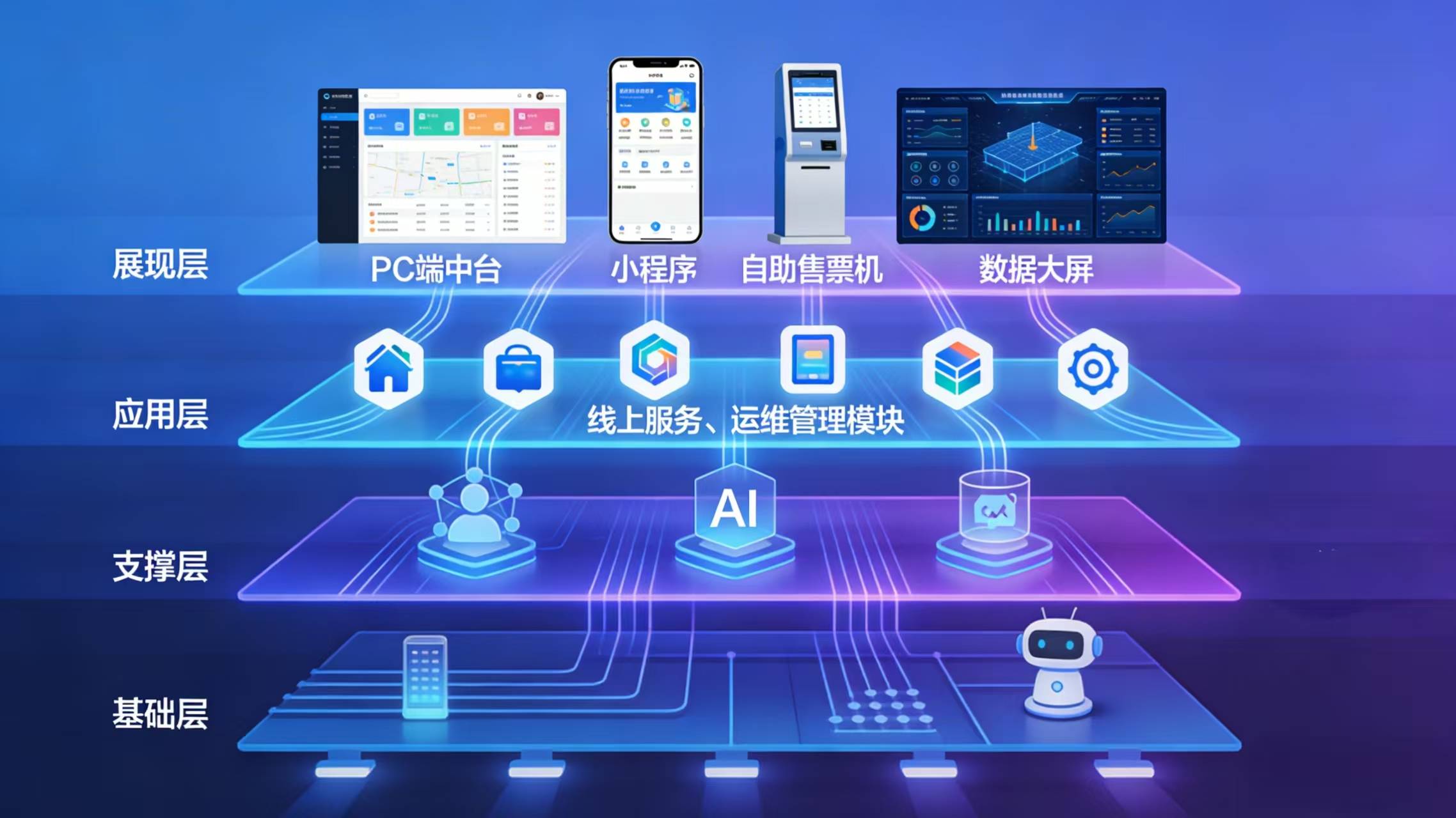 解决方案构建全层级架构体系,各层级协同联动,为智慧场馆运营提供坚实技术支撑。展现层聚焦多场景便捷访问,涵盖PC端中台、公众号/小程序、自助售票终端及可视化数据大屏,实现服务与管理的多渠道触达;应用层整合全业务场景功能,涵盖线上服务、场馆运维管理、物业管理、基础管理等核心模块,实现业务流程全覆盖与高效协同。