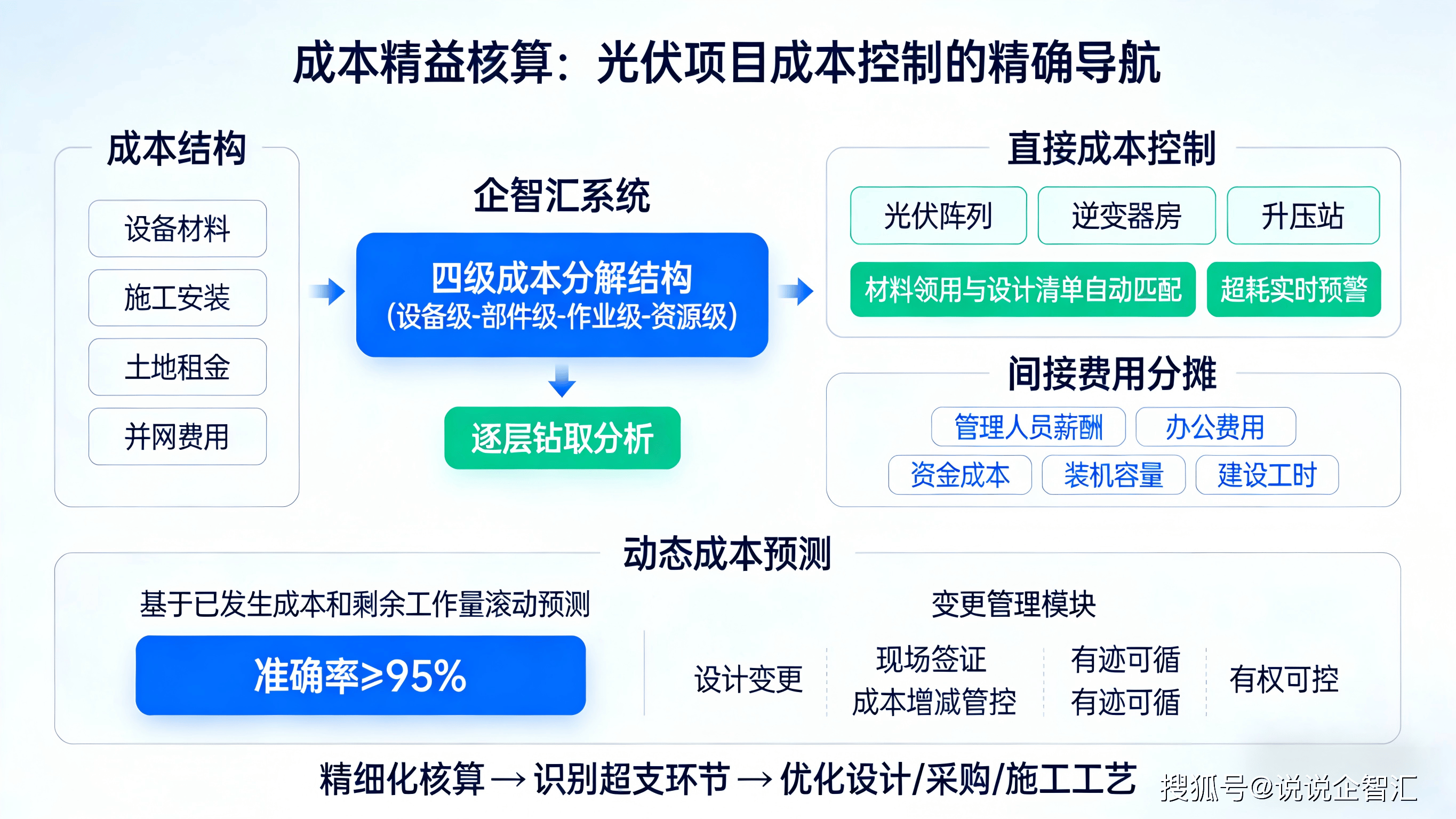 光伏项目成本结构复杂,涵盖设备材料、施工安装、土地租金、并网费用等多个维度。企智汇系统建立四级成本分解结构(设备级-部件级-作业级-资源级),实现成本的逐层钻取分析。