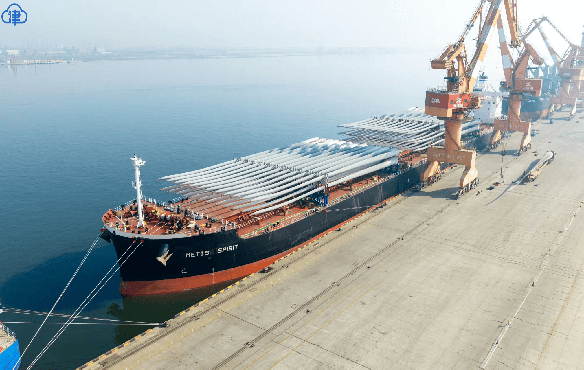 日前,在天津临港海关的监管下,“墨提斯精神”轮装载着天津中车风电叶片工程有限公司出口的96支风电叶片缓缓驶离临港港务码头,前往西班牙卡斯特利翁,为绿色能源项目建设注入中国力量。这是本月经临港港务码头出口的第4船风电设备。